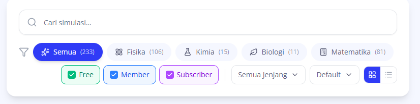 Buat teman-teman yang akes ke https://simu.konsep.com , biasanya jika buka ke daftar simulasi. Akan banyak aplikasi yang tersedia. Di daftar ini dibagi menjadi 3 jenis: free, member, dan subscriber. Berikut adalah bedanya:
